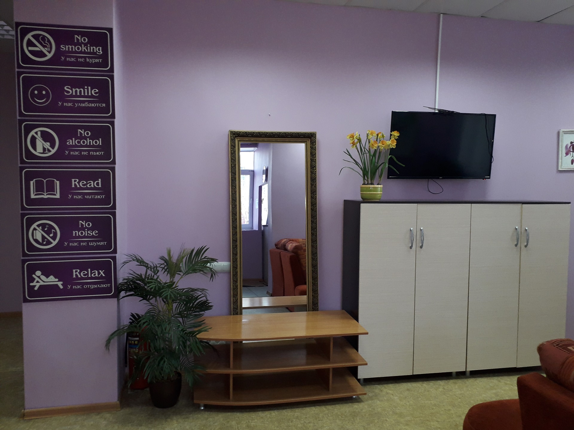 В комнате есть все необходимое для комфортного размещения: умывальник с зеркалом, вешалка для одежды, журнальный столик и ЖК-телевизор.